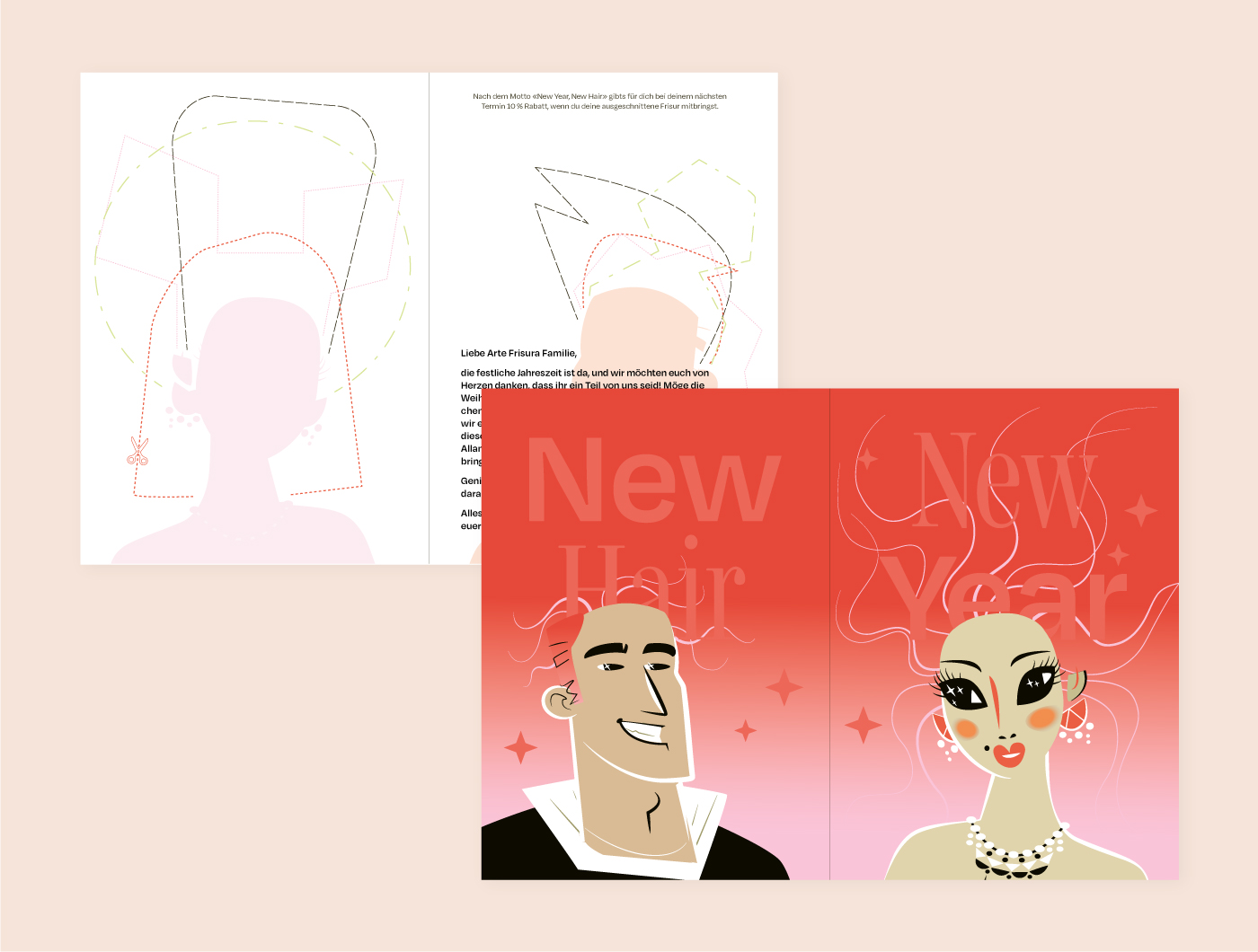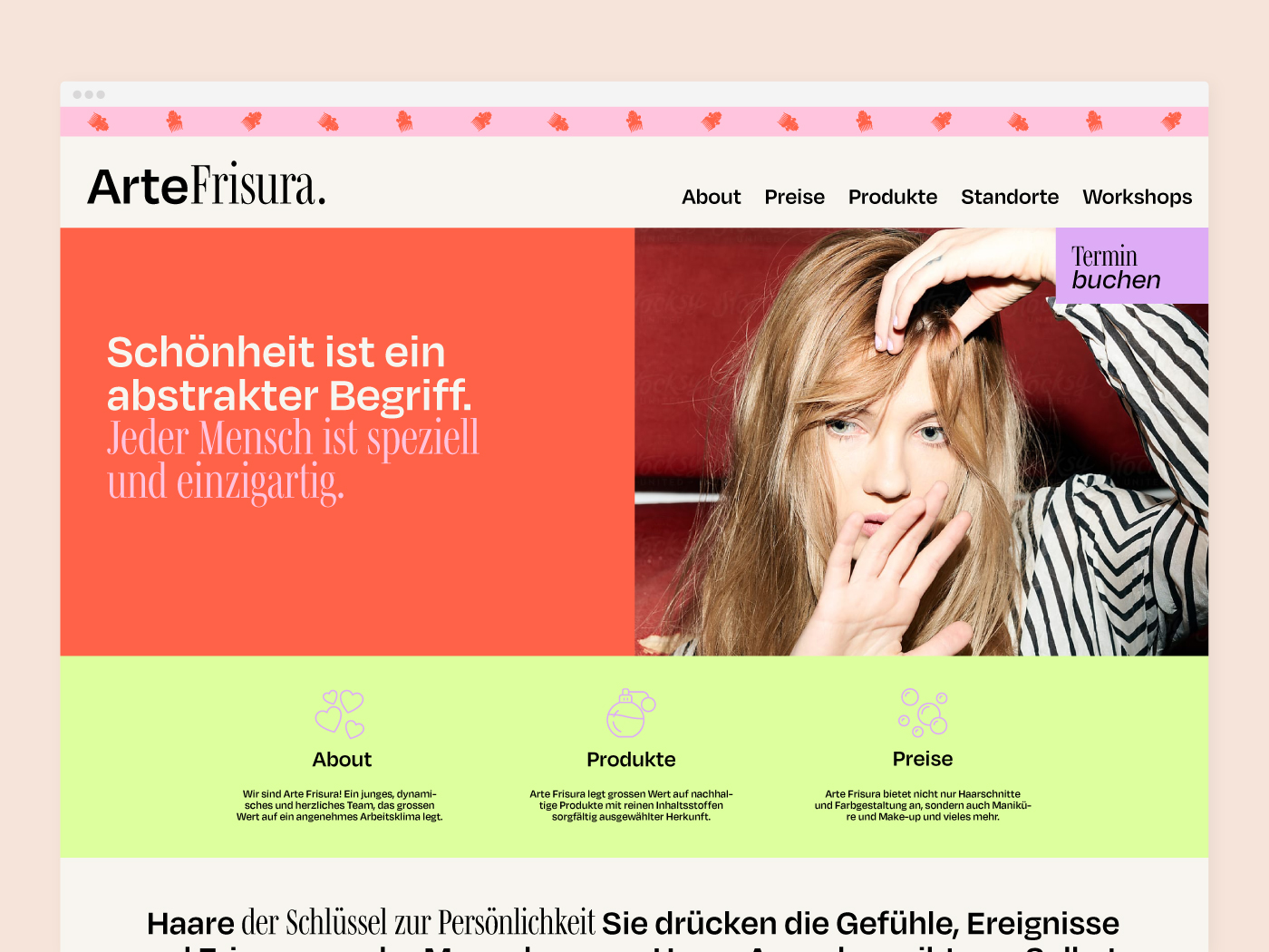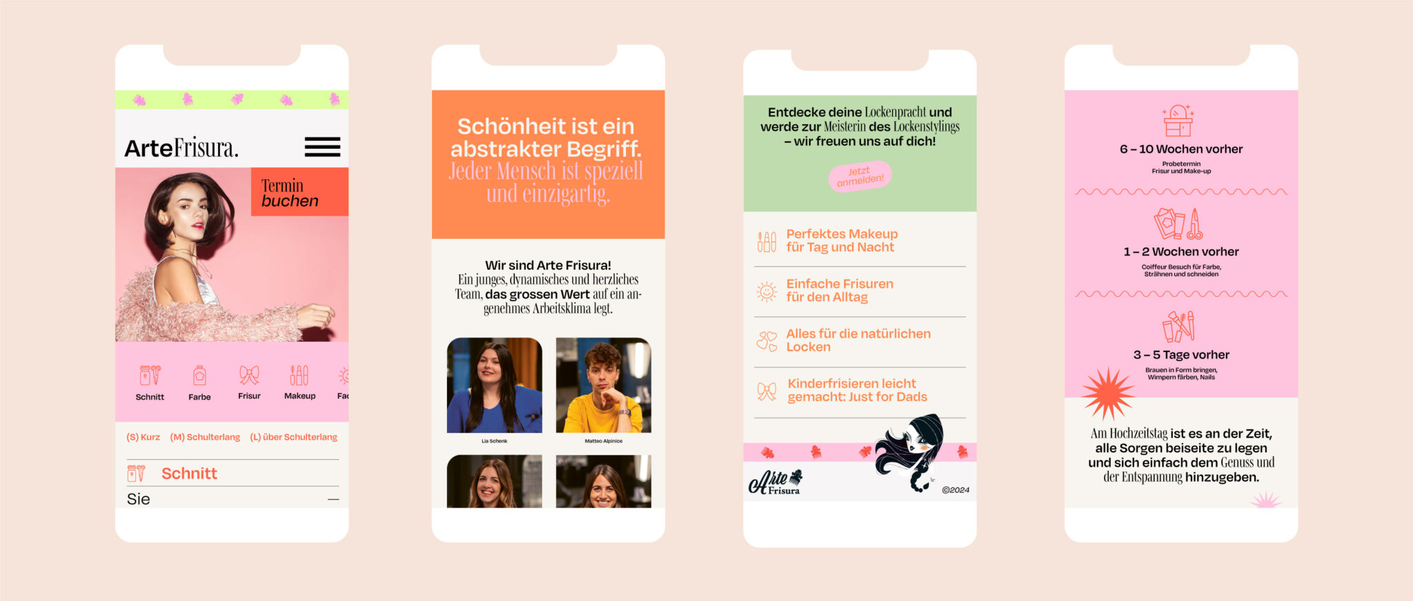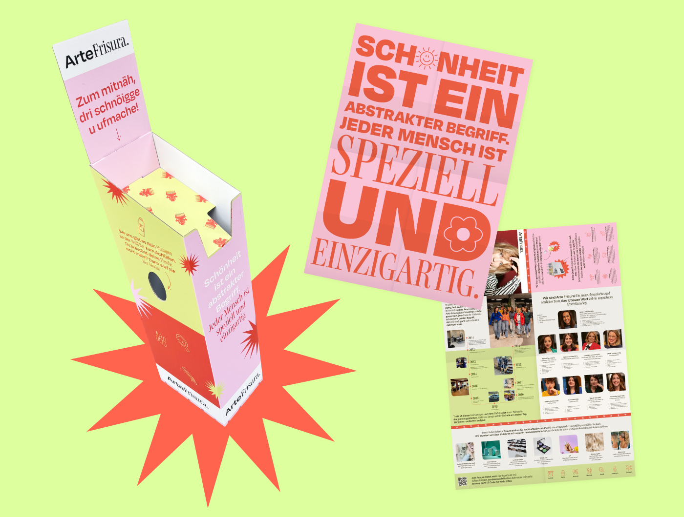 Arte Frisura est une cliente de longue date. Merci beaucoup pour ta confiance, chère Sandra ! Après de nombreuses années, il était temps de repenser le design. En tant que salon de coiffure et de beauté, nous voulions créer une image de marque contemporaine qui ose la couleur. Grâce à différentes typographies, nous avons rendu la lecture des offres variées plus captivante.